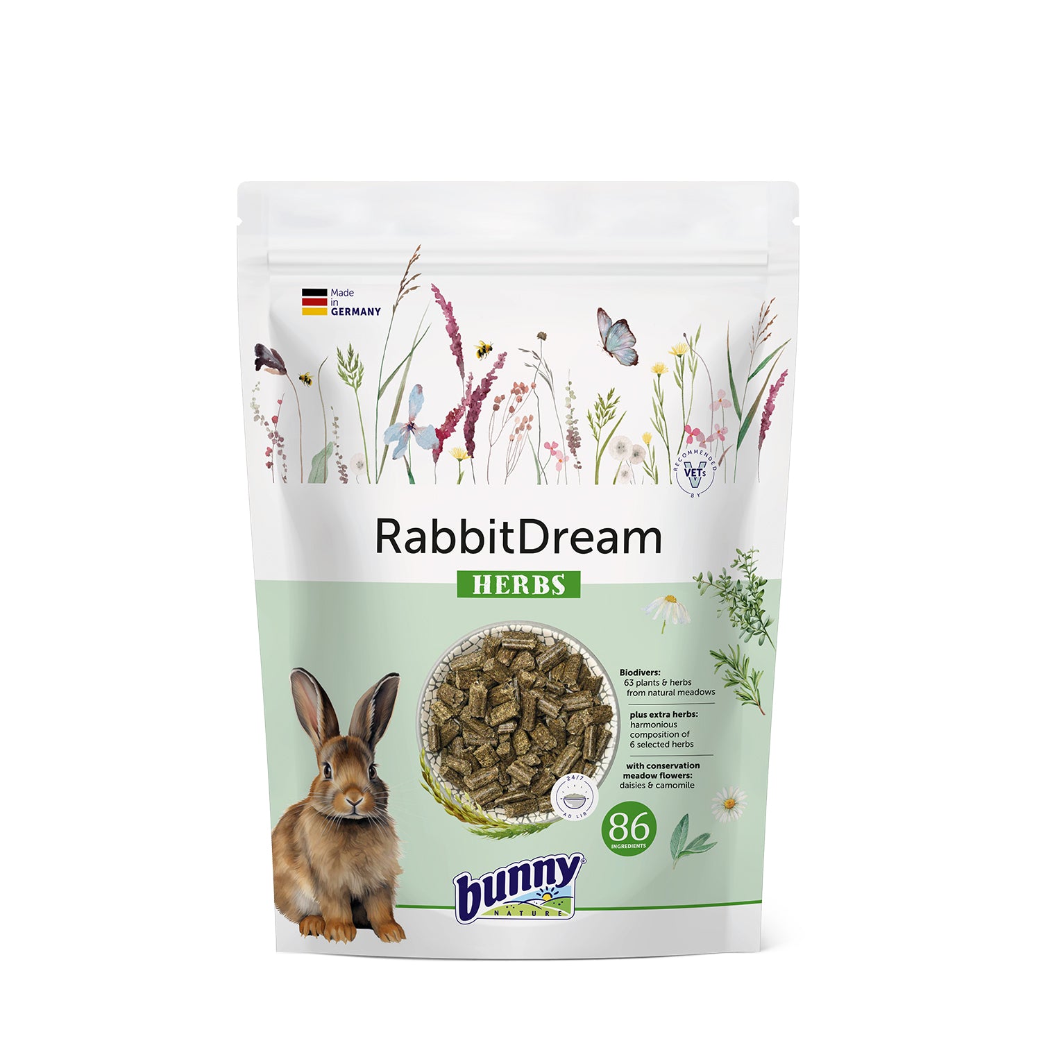 Stormåra, Blodnäva, Prästkrage, Åkervädd, Rosa Ängsbräsma, Strandlysing, Åkerveronika, Knylhavre, Rajsvingel, Groblad, Väddklint, Småbladig Vicker, Förgätmigej, Mandelblomma, Bockrot, Revfingerört, Gullviva, Sommarglim, Kustruta, Grässtjärnblomma, Ängshaverrot, Brännässla, Majveronika, Rödklöver, Häckvicker, Kirskål, Tusensköna), Havreskalskli, Solrosfrögröpe, Linfrögröpe, Morotsrester, Äpplerester, Vetekli, Rapsfrögröpe, Cikoriainulin (0,6%), Kamomillört, Brännässelblad, Vresros Groblad, Färnkålsfrön, Lakritsrot, Altearot, Tusensköna, Rosmarinblad, Anisfrö, Trampört, Timjan, Salviablad, Röllekablast, Kamomillblommor, Kalmusrot (örter 6% blommor 1%).