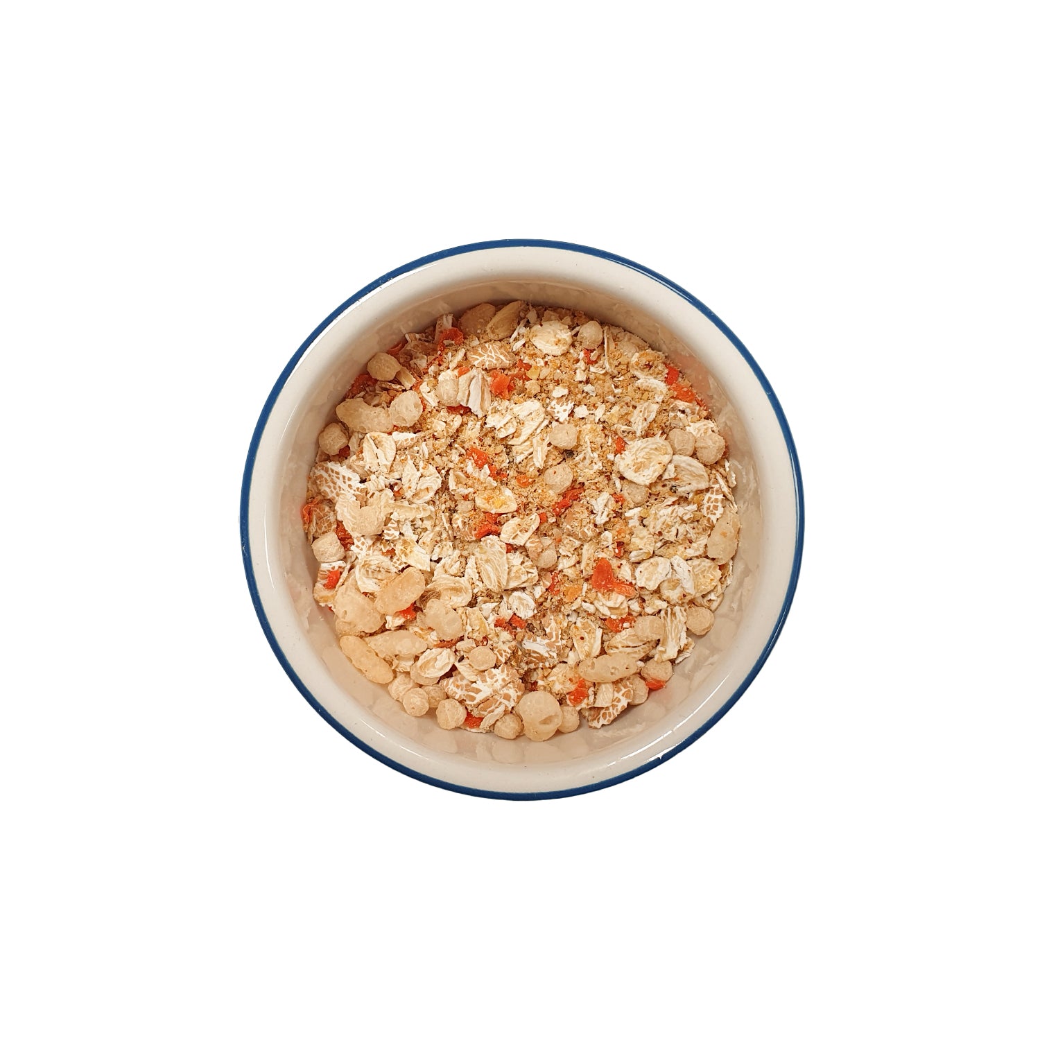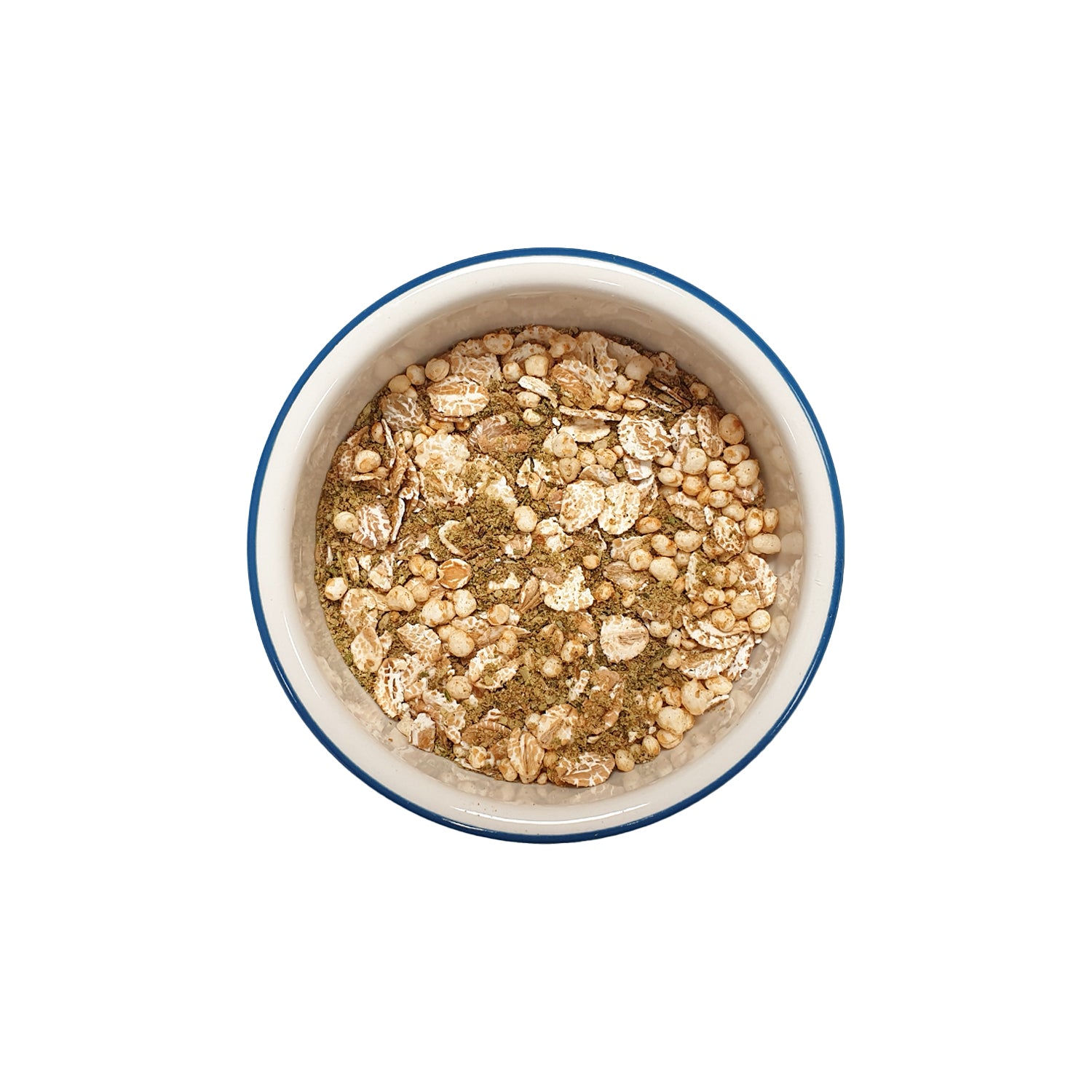Kornflingor, Rågflingor, Quinoapuffar, Hirspuffar, Havreringar, Hampaproteinpulver, Sojapuffar, Grahamsgryn, Nässlor, Chiafrön, Paprikapulver.